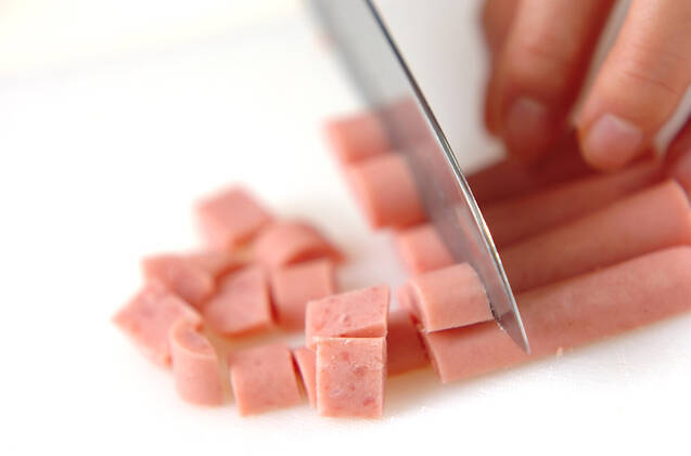 水煮大豆はザルに上げる。ソーセージ、玉ネギ、キャベツは、水煮大豆くらいの大きさに切る。