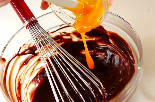 (4)を(3)に注ぎ、泡立て器でやさしく混ぜる。卵黄を加え、混ぜる。