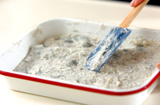 エビが入ったボウルに、<調味料>の材料を加えて混ぜ合わせ、バットに広げて冷凍庫に10分入れて扱いやすくする。
