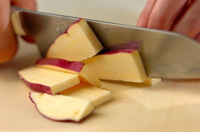 サツマイモは皮ごとキレイに水洗いし、短冊切りにして水にさらし、水気をきる。耐熱容器に入れてラップをし、電子レンジで2分30秒加熱する。