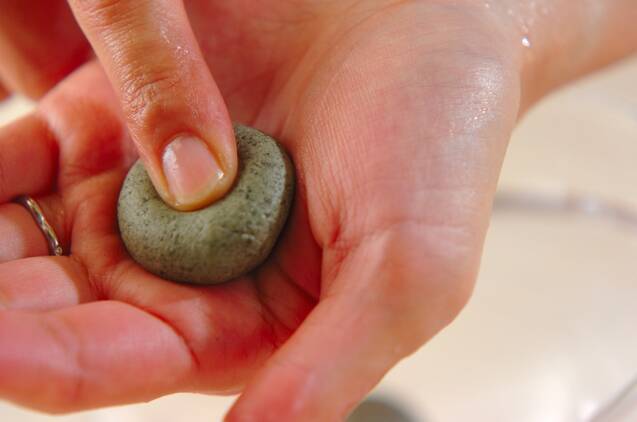 (2)を10等分(2人分)にして丸め、中央を指でへこませながら、たっぷりの沸騰したお湯に入れてゆでる。浮き上がってきたら1分ほどそのままゆでて水に取る。