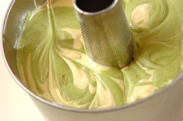 型に3の白い生地と4の抹茶生地を交互に流し入れ、最後に竹串を上下左右に動かしながらマーブル模様を作り、170℃に予熱しておいたオーブンで約25~30分焼く。竹串を刺してみて、何もついてこなければオーブンから出し、逆さまにして冷ます。