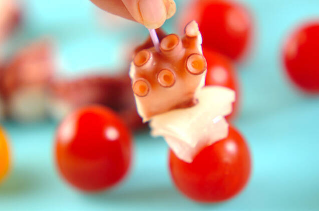 プチトマトはヘタを取って水洗いし、水気を拭き取る。ゆでタコ足、玉ネギ、プチトマトをピックに刺し、EVオリーブ油を全体にからめ、ミルびき岩塩、パプリカパウダーを振る。器に盛り、イタリアンパセリを散らす。