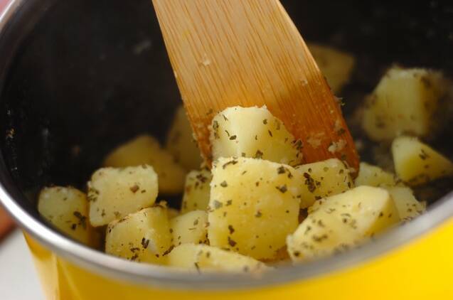 (2)にバジルとガーリックパウダー、塩コショウを加え、全体にからめて、器に盛る。