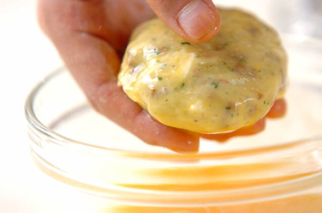 8等分の小判型にまとめ、<衣>の小麦粉、溶き卵、パン粉を順につける。