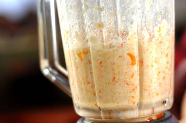 (2)と絹ごし豆腐をミキサーでかくはんし、容器に流し入れ、冷蔵庫で冷やしかためる。