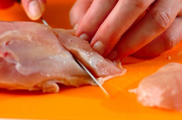 鶏むね肉は半分に切り分け、大きめの削ぎ切りにする。