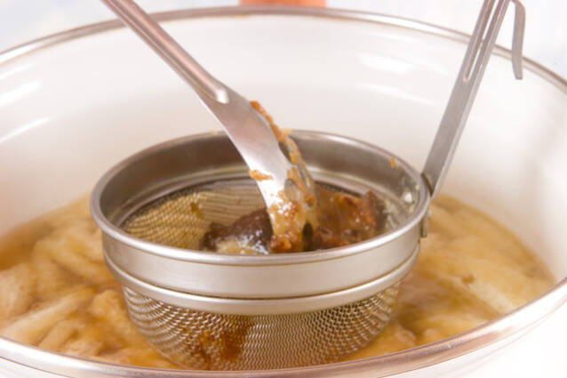 鍋にだし汁を入れ強火にかけ、煮立てば豆腐、油揚げを加える。再び煮立てば、みそを溶き入れ、最後に刻みネギを加え火を止める。生ワカメを入れておいた器によそう。