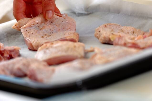 オーブンペーパーをしいた天板に、鶏もも肉を皮が上になるように並べ、200℃に予熱しておいたオーブンで10分程焼く。