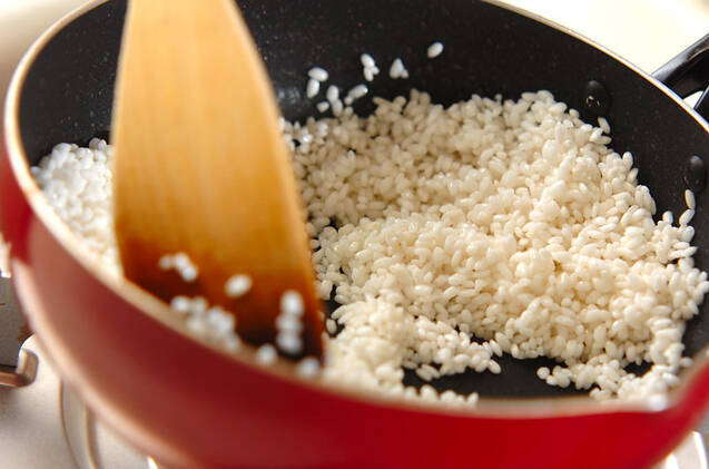 フライパンに残りのサラダ油を強火で熱し、もち米を加えて全体に炒め、(2)の煮汁を加えてよく混ぜ合わせ、炊飯器に入れる。