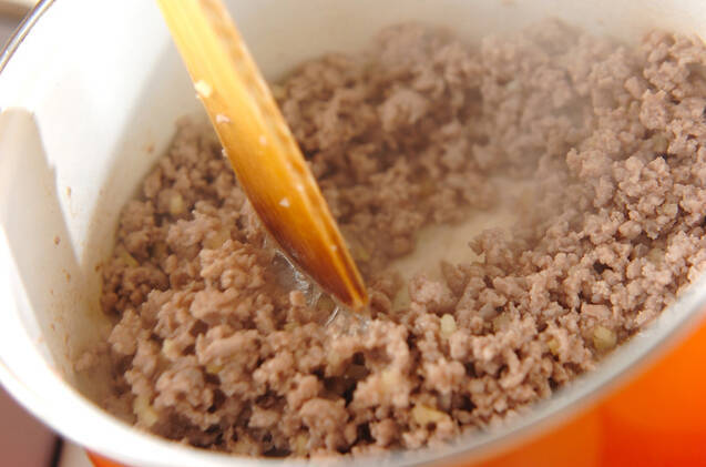 鍋にゴマ油を熱し、豚ひき肉を色が変わるまで炒め、ショウガも加えて炒め合わせる。