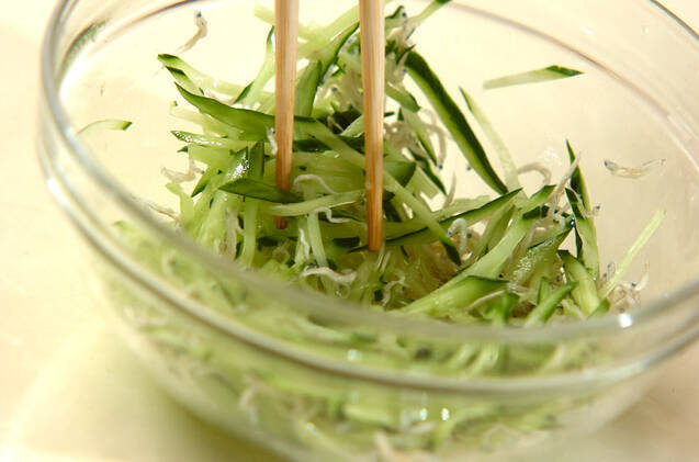 ボウルに水気をきったキュウリ、チリメンジャコ、作り置き甘酢、だし汁を加えて和え、器に盛る。