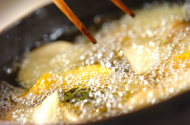 ジュワジュワっと大きな泡からシュワシュワっと小さな泡になったら揚げ油から取り出し油を切る。ユカリ、粉ワサビと一緒に紙袋に入れて袋の口をとじてよく振って絡め、器に盛り分ける。