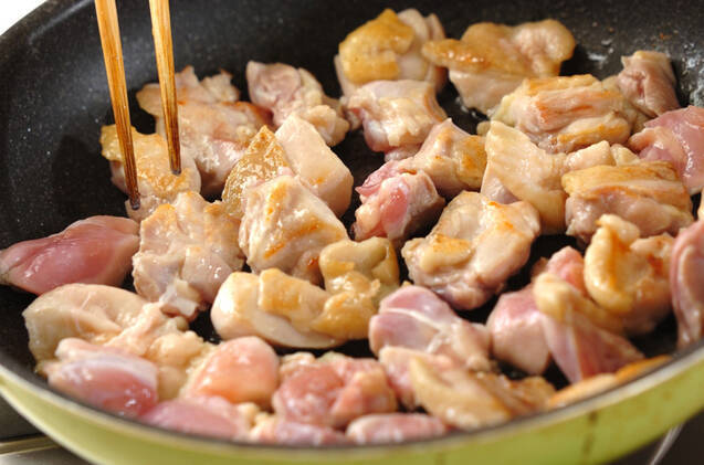 フライパンにサラダ油を熱し、鶏もも肉の皮面を下にして並べる。焼き色がついたら返して火を通し、いったん取り出す。