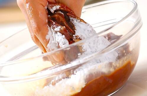 牛レバーは水洗いして水に放ち20分置き、斜め切りにして<レバーの下味>をからめ、片栗粉を混ぜ合わせて15分置く。