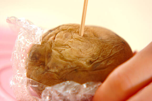 ジャガイモは皮ごときれいに水洗いし、濡れたままラップで包んで、電子レンジで2分加熱し、向きを変えてさらに1~2分加熱する。竹串がスーッと刺さったらOKです。