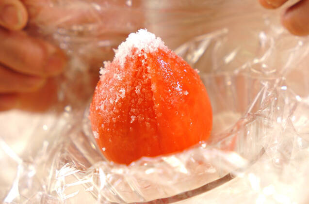 トマトに6~8つの切り込みを入れ、ラップにのせて白ワイン、塩、砂糖をかけ、しっかり包んで冷蔵庫で冷やす。(ヒント)調理時間に冷やす時間は含みません。