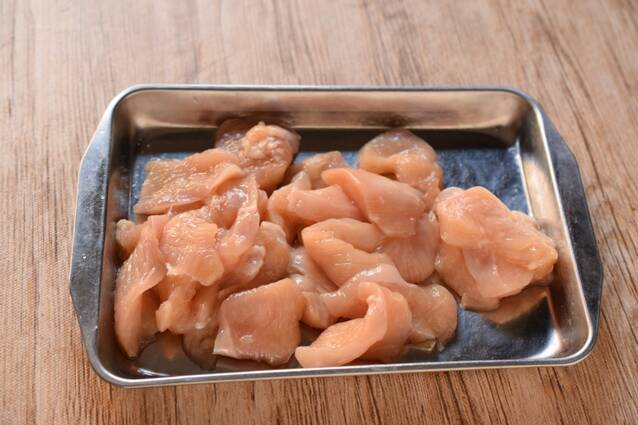 鶏むね肉は塩と酒を振り、水分がなくなるまで揉みこむ。
