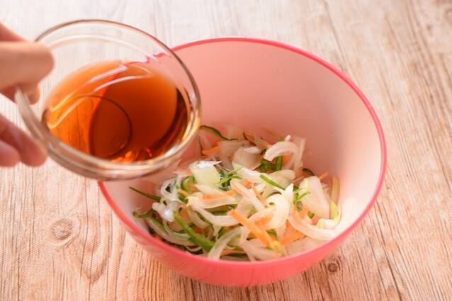 (2)を水で洗い流し、しっかり絞って水けをきる。③を入れて、混ぜ合わせる。