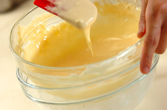 冷やしておいた(2)の生クリームを(5)のボウルに加え、ボウルの底を氷水で冷やしながらゴムベラでトロ~ンとなるまで混ぜながら冷やす。