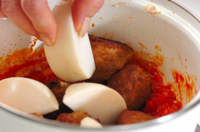 水煮トマト、塩、ローリエを加え、水気がなくなるまで中火で煮詰める。ミートボール、カブ、エリンギ、水を加え、蓋をして10分程煮込む。