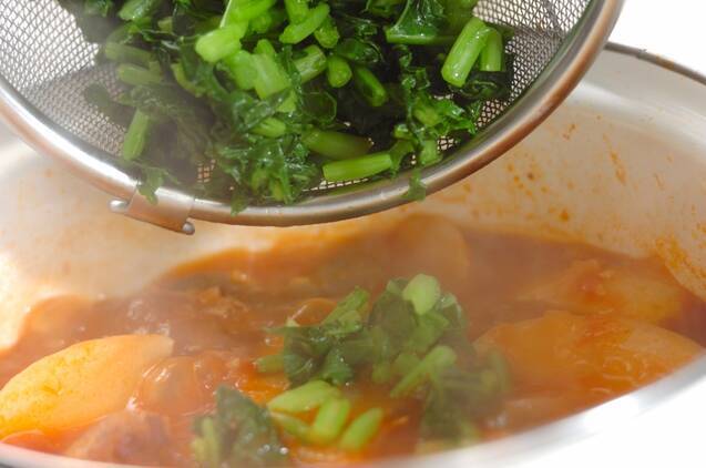 カブの葉を入れて、分量外の塩で味を調える。器に盛り、お好みでパルメザンチーズをかける。