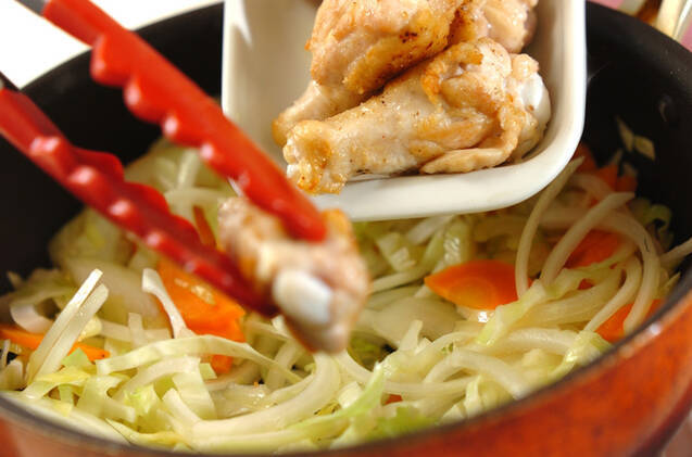 (1)に、玉ネギ、ニンジン、セロリ、キャベツを加えて炒め合わせる。全体にしんなりしたら(1)の鶏手羽元を戻し入れ、塩コショウをして<スープ>の材料を加え、強火にする。