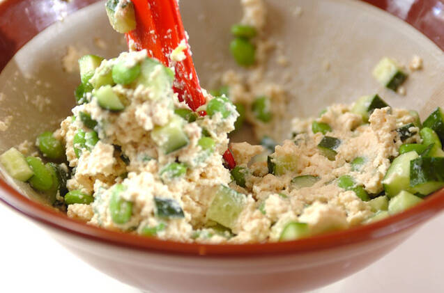 枝豆、キュウリを(2)に加えてサッと和え、器に盛り分ける。