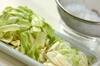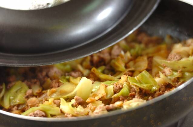 <調味料>を加えて火を弱め、フライパンに蓋をして5分蒸し煮にする。