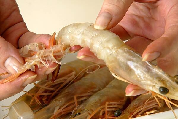 有頭エビは殻をむき、背ワタを取って塩水で洗い、水気をきる。