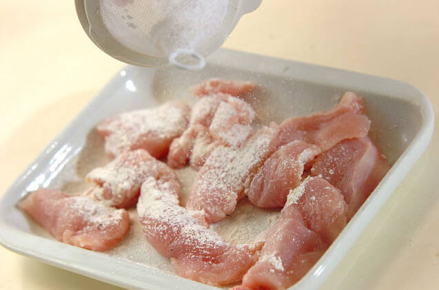 鶏むね肉は1切れずつ小麦粉をからめる。