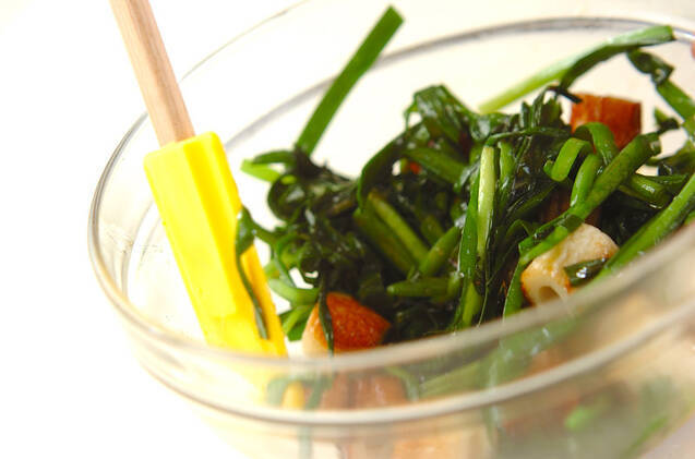 <中華ドレッシング>のボウルに、ちくわとニラを加えて和える。器に盛り、白ゴマを振る。