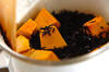 鍋にサラダ油を中火で熱し、芽ヒジキ、カボチャを炒め合わせる。