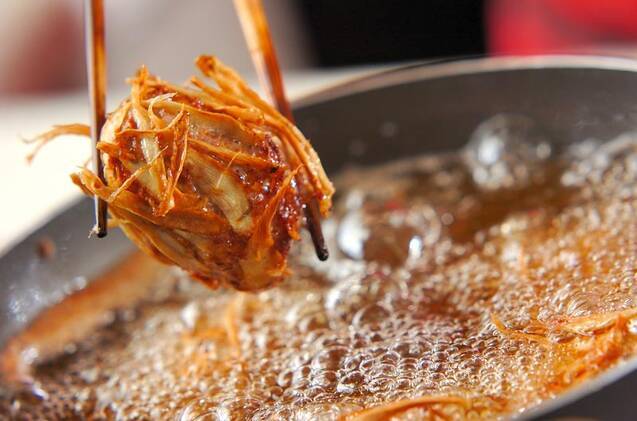 170℃の揚げ油に入れて色よく揚げる(約3~4分で揚がります)。サラダ菜をしいた器に盛り、<ソース>を添える。