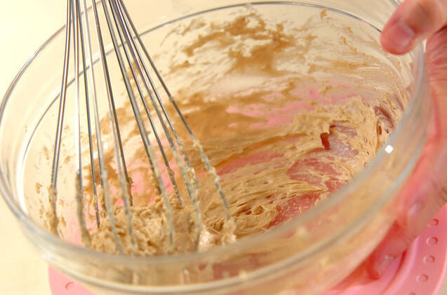 <生地>を作る。ショートニング、バターにブラウンシュガーを加え、泡立て器でポッテリするまでしっかり混ぜ合わせる。溶き卵を数回に分けて加え、よく混ぜ合わせてバニラエッセンスを加え、さらに混ぜ合わせる。