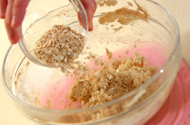 振るった粉類を加えてゴムベラで混ぜ合わせ、さらにおから、オートミールを加えてサックリ合わせる。