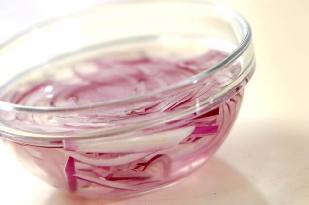 ルッコラは根を切り、食べやすい大きさに切る。紫玉ネギはスライスし、水にさらしてから水気をきる。