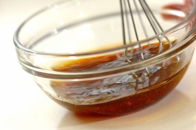 <ユズドレッシング>の材料をボウルに入れ、泡立て器で混ぜ合わせる。