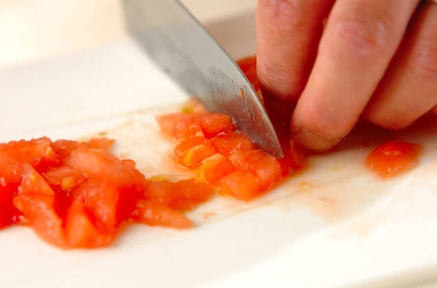 (1)でくり抜いたトマトの中身の種の部分を取り除き、粗みじん切りにする。