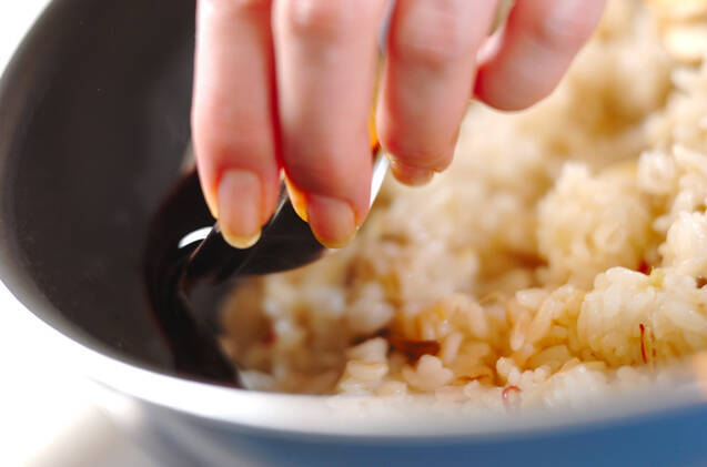 キノコが少ししんなりしたら刻み赤唐辛子、松の実、麦入りご飯を加えて炒め、しょうゆを加える。全体に炒められたら塩コショウで味を調えてイタリアンパセリを混ぜ込み、器に盛る。