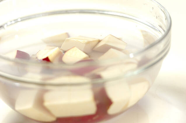サツマイモは皮ごとよく洗って2cm角に切り、水に放って水気をきる。