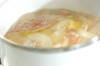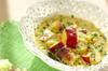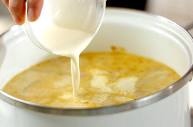 牛乳、カレー粉、生クリームを加えて沸騰直前で火を止め、塩コショウで味を調える。器に注ぎ、ドライパセリを散らす。