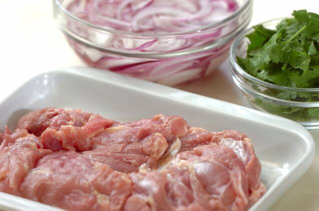 鶏もも肉は、余分な脂と皮を切り落とし、厚みのあるところに切れ目を入れ、均等の厚さにする。紫玉ネギは薄切りにし、水にさらす。パクチーは長さ3cmに切る。