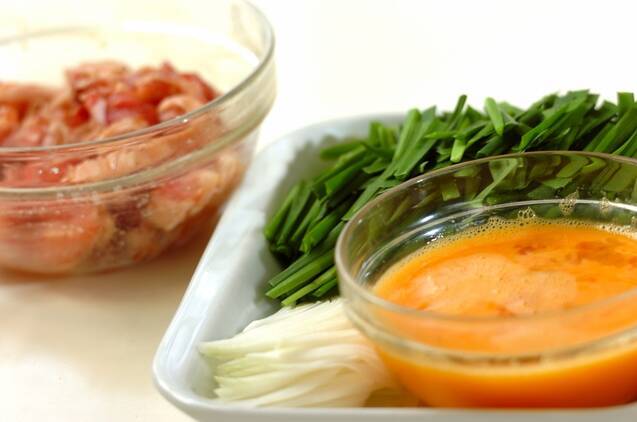 豚バラ肉は食べやすい長さに切り、<下味>の材料をもみ込む。ニラは根元を切り落とし、長さ4cmに切る。卵は溶きほぐす。玉ネギは縦薄切りにする。