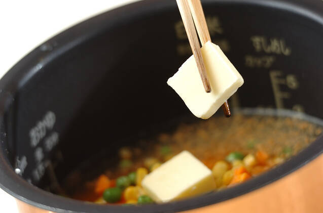 (1)にすりおろしたニンジン、ミックスベジタブル、バターを加え、スイッチを入れて普通に炊く。炊き上がったらしゃもじで炊飯器とご飯の間に隙間を作るように1周し、底から持ち上げてほぐしながら余分な水分を飛ばす。器に盛り、ドライパセリを振る。