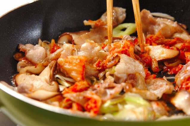 フライパンにサラダ油を中火で熱し、豚バラ肉、白ネギ、シイタケを炒め合わせ、白菜キムチを加えてさらに炒め合わせる。