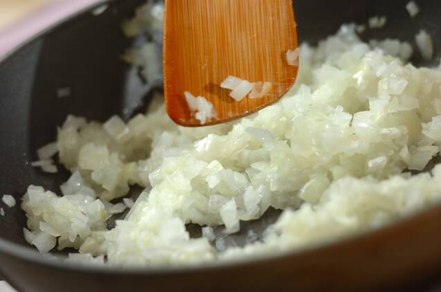 玉ネギは粗いみじん切りにしてフライパンに移す。サラダ油小さじ1と塩少々を加えて中火にかけ、しんなりするまで炒める。