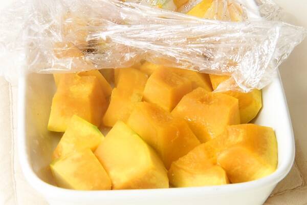 カボチャは種とワタを取り、皮を削ぎ落とし、大きめの一口大に切り、水洗いする。ぬれたまま耐熱容器に入れ、ラップをかけて4~5分電子レンジで加熱する。