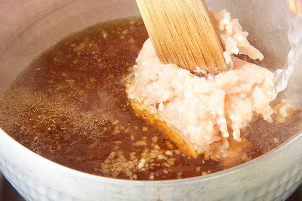 鍋に<合わせだし>を入れて強火にかけ、煮立てば鶏肉を加える。