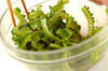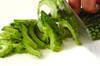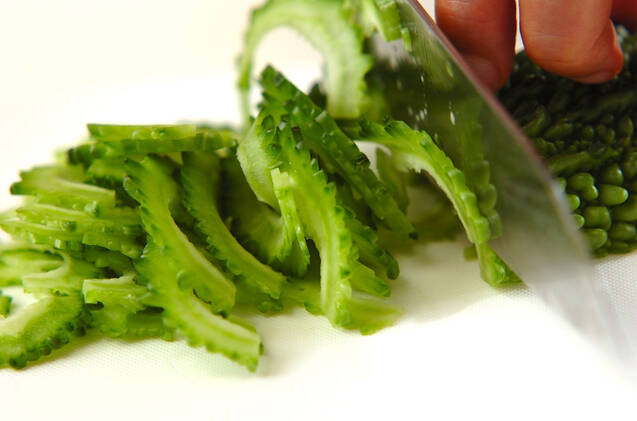 ゴーヤは縦半分に切って種とワタを取り、薄切りにして塩で軽くもみ、2~3分おく。水分が出てきたら、熱湯でサッとゆでて水洗いし、水気を絞る。(ヒント)切り方が薄いほど苦みが弱くなります。